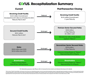 If approved and at closing of the proposed Recapitalization Transaction, Corus’ existing secured revolving credit facility will essentially continue (technically, it will be amended and restated into a new, $125 million secured revolving credit facility). The existing secured term loan will be settled and exchanged for new senior secured notes in the aggregate principal amount of $300 million.